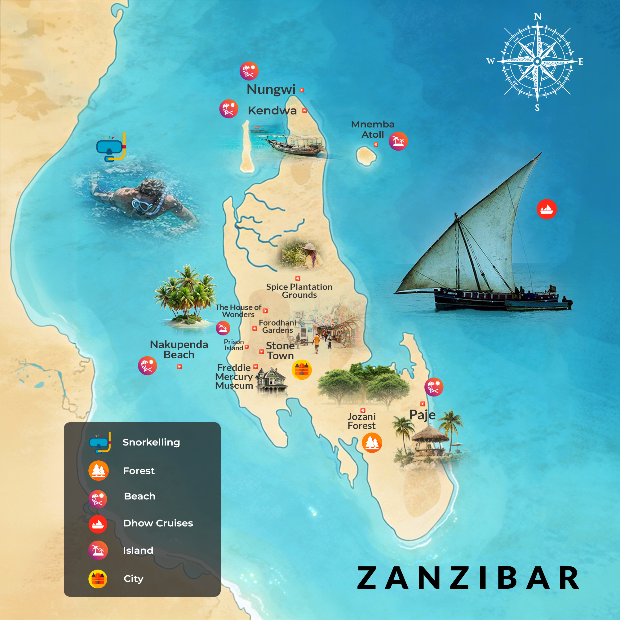 Zanzibar is a tropical island destination renowned for its white-sand beaches, turquoise waters, and rich Swahili heritage. Beyond relaxation, visitors can explore Stone Town’s historic sites, spice plantations, and marine life through snorkeling and diving. Often paired with Tanzania safaris, Zanzibar offers the perfect balance of culture, history, and post-safari beach luxury.
